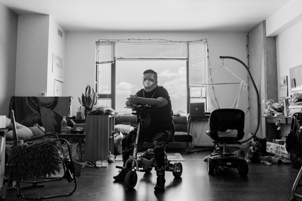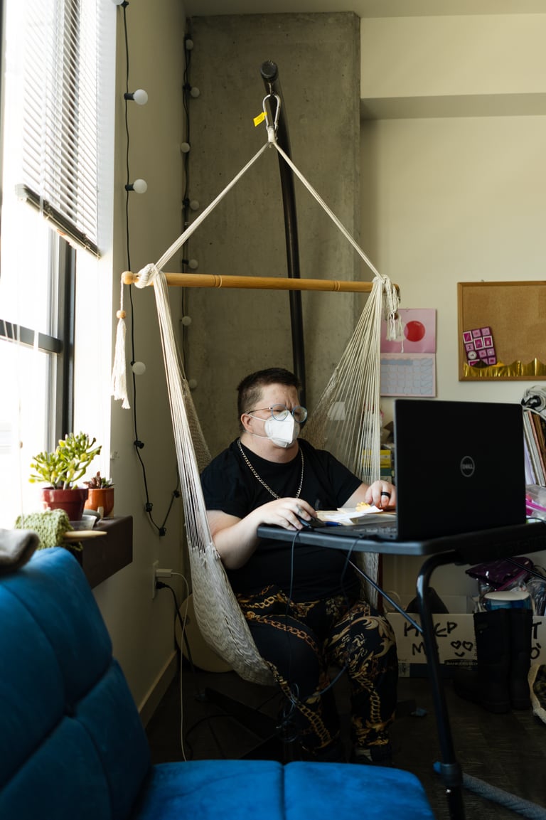 Something else we wanted to portray was how so many disabled people use the internet as their main source of socialization and community, especially during a pandemic when it's not safe for most of us to be in public. Jack spends a lot of their time in their hammock chair (which I'm so jealous of) communicating with their friends and community on their computer. While this can sometimes be isolating, it gives us access to something we wouldn't have otherwise.