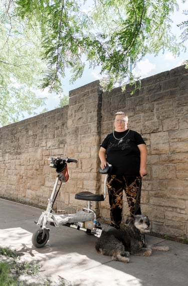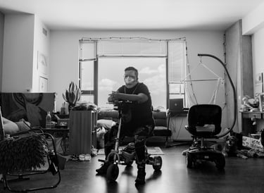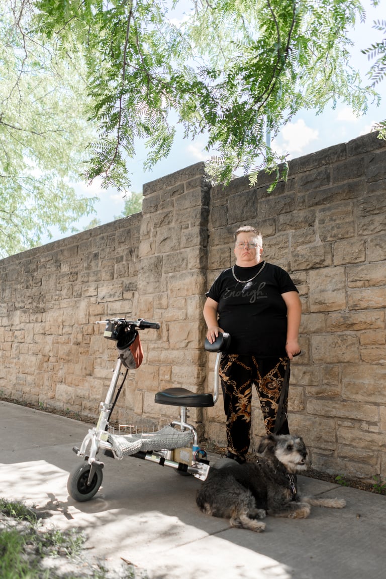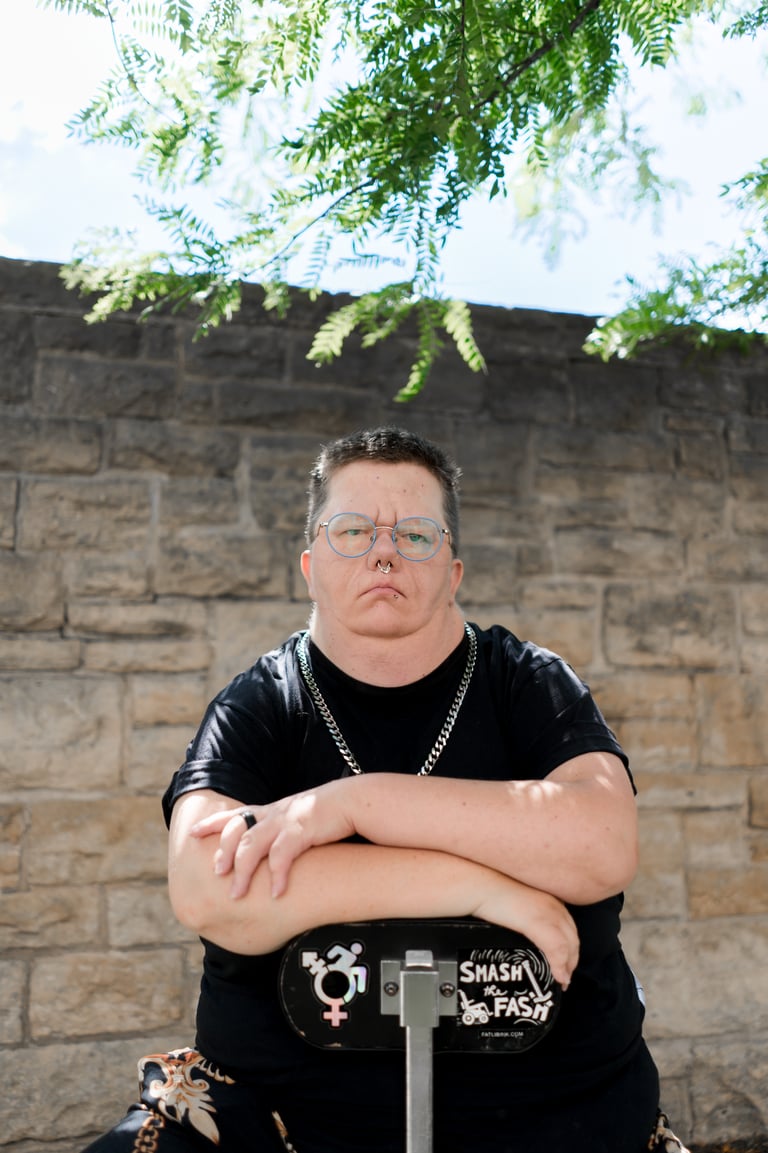 Jack and I talked about the importance of including mobility aids in photos, and specifically being an ambulatory mobility scooter user. So many disabled folks get accosted or are anxiously awaiting to be for standing up while using a chair or scooter. This is an unfortunate reality of so many people's lives and while we couldn't easily get a photo of someone giving Jack a dirty look, we could get a photo of them looking powerful while standing behind their scooter. Mobility aids bring freedom and access to so many, even those who can stand and walk sometimes, and can be a great source of joy and power. I hope we can crush the misconception that those who use wheelchairs or scooters have no use of their legs. There are infinite ways to be disabled and infinite ways to use mobility aids.