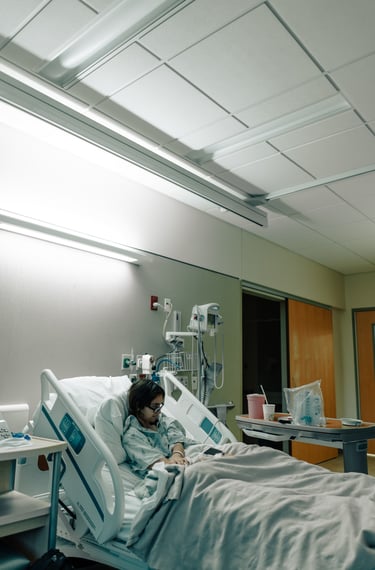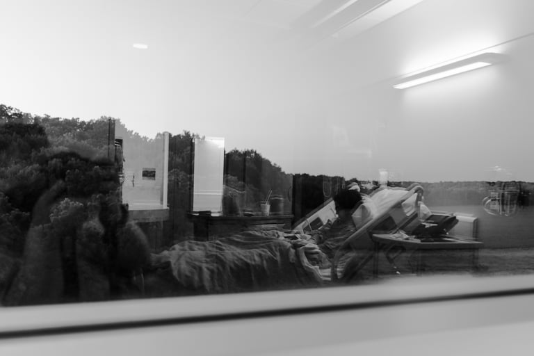 As the photographer, the above photo called to me because it shows evidence of Rachel's experience being witnessed because of my reflection being included. But at the same time, it shows evidence of the isolation one can experience in medical settings. Outside of this hospital is a beautiful forest that patients can only experience through windows.